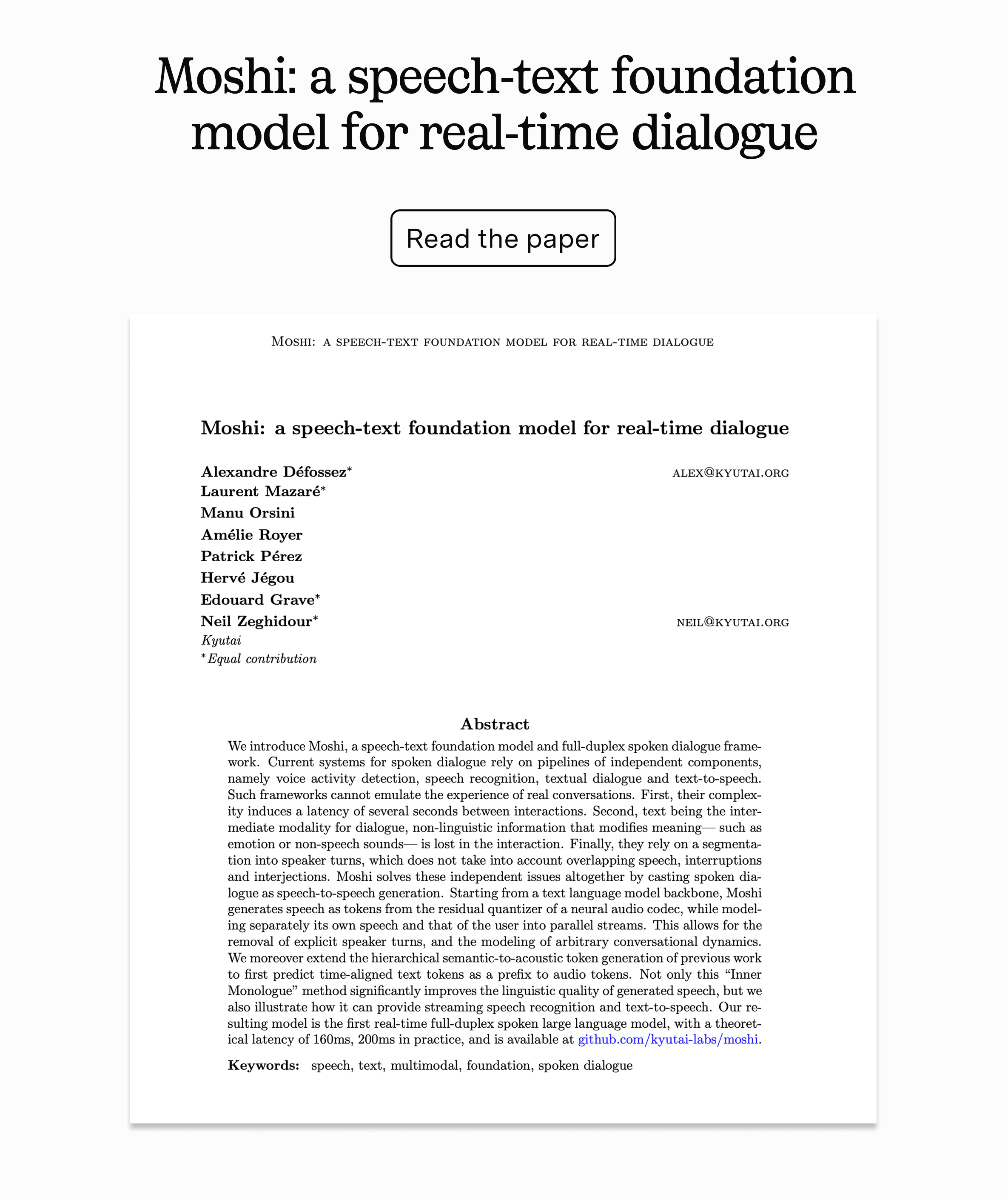 You can see (hear?) this idea in action by talking to Moshi, Kyutai’s realtime audio foundation model they released last year. It was the first realtime audio model on the planet, almost miraculously built by a non-profit team of 8 with a budget that was orders of magnitude smaller than the big labs. It’s a little rough around the edges, but the experience is pretty incredible.