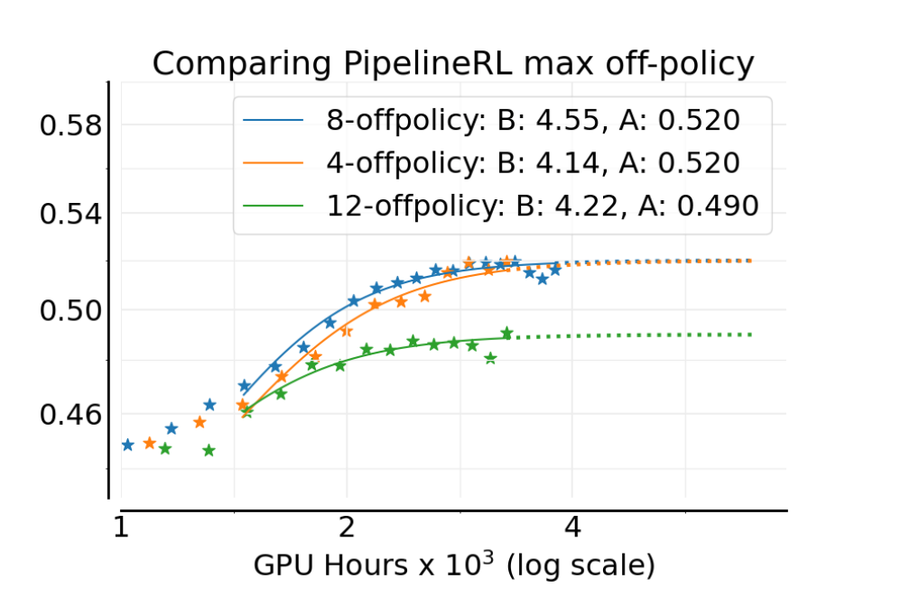 It turns out you can get away with a surprising amount of staleness. The aforementioned ScaleRL paper, authored by a cross-discipline group of academics and Meta researchers, explored this trade-off directly in the context of their 70B Llama 3-V model. In their Asynchronous RL Setup, they allowed the generators to get up to k steps ahead of the trainer. They found that a k value of around 8 – meaning the data could be up to 8 training steps old – had minimal impact on performance while dramatically improving hardware utilization{{justin-rl-1}}.
