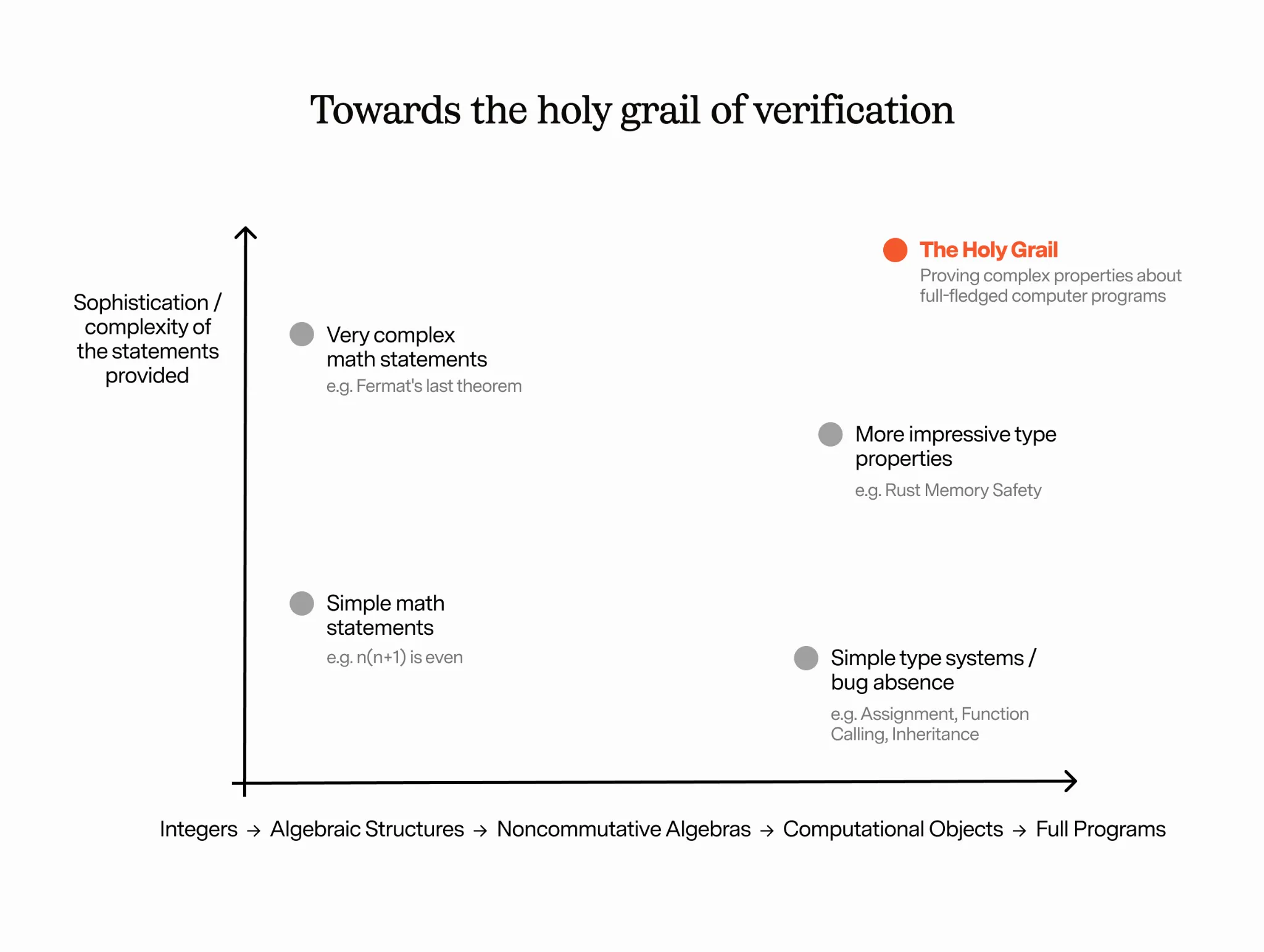 Meanwhile, in another dimension, we represent the sophistication of the statements. Towards the bottom left, we have very elementary proofs statement like for all n, n*(n+1) is even. As we get more involved, we approach very complex statements, perhaps even unproven conjectures like the Riemann Hypothesis. On the bottom right we have the simplest of type systems, perhaps just statements about the absence of simple bugs to do with assignment and function calling following simple inheritance rules. As we get higher, we prove more impressive properties (think Rust memory safety).